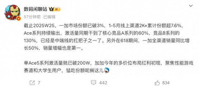 随着618活动的落幕,各大手机品牌都迎来了短暂的销量爆发期。就拿一加来说,博主“数码闲聊站”透露:截止2025年第25周,一加的市场份额已经突破3%,一加Ace系列持续发力,在中端机市场拿下了好成绩,618期间更是销量增幅行业第一!其中一加Ace5系列的激活量已经超过200万台,市场表现可谓是强劲!